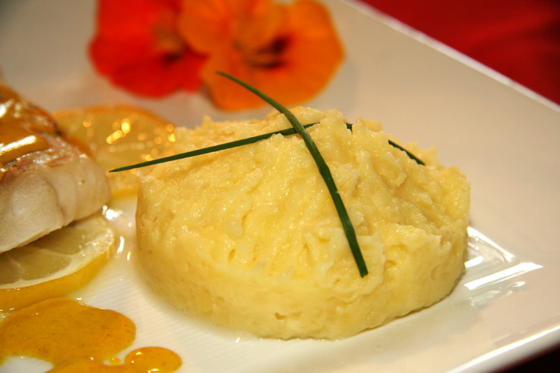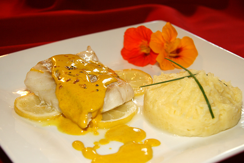 Disposer un dos de cabillaud nappé de la sauce au curcuma sur chaque assiette accompagné de son écrasée de purée.