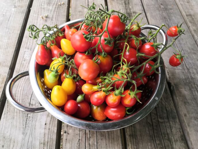 Une bonne idée pour utiliser ces tomates cerises qui sont prolifiques chez moi également. De plus des pieds qui se sont semés tout seul…