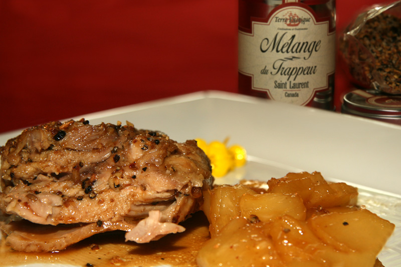 Suite à la réception du colis de Terre Exotique qui contenait un choix d’épices impressionnant et je remercie Estelle pour leur générosité, je voulais utiliser les épices mélange du Trappeur venant du Canada disons du Québec car le St-Laurent est le fleuve phare du Québec et beaucoup savent combien j’y ai mes attaches. Pour la petite histoire c’est d’ailleurs Jacques Cartier qui le baptisa ainsi car il en fit la découvert le jour de la St-Laurent. Donc beaucoup de recette avec du poisson pour ces épices mélange du Trappeur et je me suis dit, pourquoi pas avec une cuisse de dinde accompagnée d’ananas glacé au sirop d’érable puisque l’on retrouve également du sirop d’érable dans les épices du Trappeur. Je peux vous assurer que c’était divin en diable (une expression bien du Québec). J’ai un mari gourmand comme vous le savez, ce fut un moment où les papilles se sont mises en action et sur le plan gustatif et olfactif un tourbillon de saveurs. Ces épices sont extraordinaires et délicieusement aromatiques. Venons en à la recette.