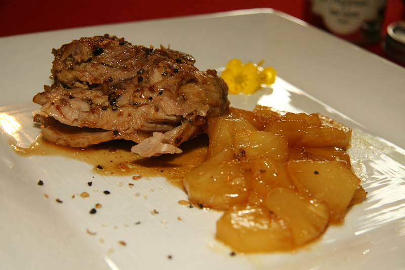Disposer dans une assiette un morceau de cuisse accompagné des ananas glacés au sirop d’érable. Saupoudrer des épices mélange du Trappeur et déguster.