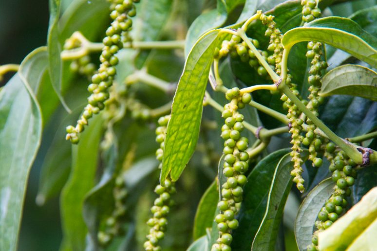 Le poivrier est une liane originaire de l’Inde, qui produit des fruits sphériques, de la grosseur d’une petite groseille, charnus, d’abord verts puis rouge foncé. Ces fruits, les grains de poivre, sont disposés en épis de vingt ou quarante.
