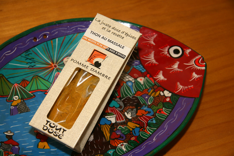 Un deuxième partenaire, Pomme d’Ambre , spécialiste en épices, qui a eu la gentillesse de répondre favorablement à ma demande. J’ai reçu, un mélange d’Épices prêt à l’emploi pour parfumer un plat. «Le Tout Dosé» qui comprenait (massalé fort, thym, poivre, gingembre, curcuma et piment fort) pour le poisson. Un mélange épicé mais tout à fait convenable, car si c’est trop épicé je crains. J’ai donc cuisiner le thon selon la recette jointe au mélange. Un délice en saveurs, accompagné d’un riz tout simple.