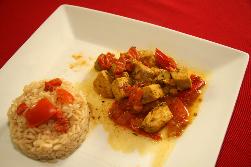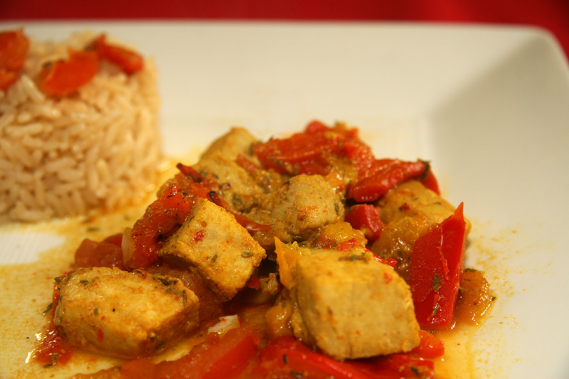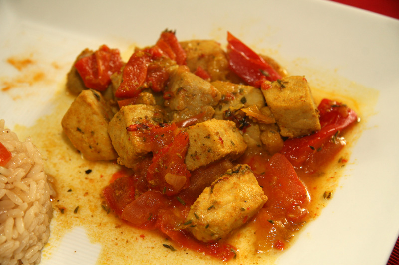 1.Découper le thon en petits cubes et fariner le avec le mélange d’épices, ajouter le sel. Réserver. Pendant ce temps faire revenir l’oignon, l’ail et la tomate et le poivron que vous aurez épluchez au préalable, c’est plus digeste. Assaisonner.